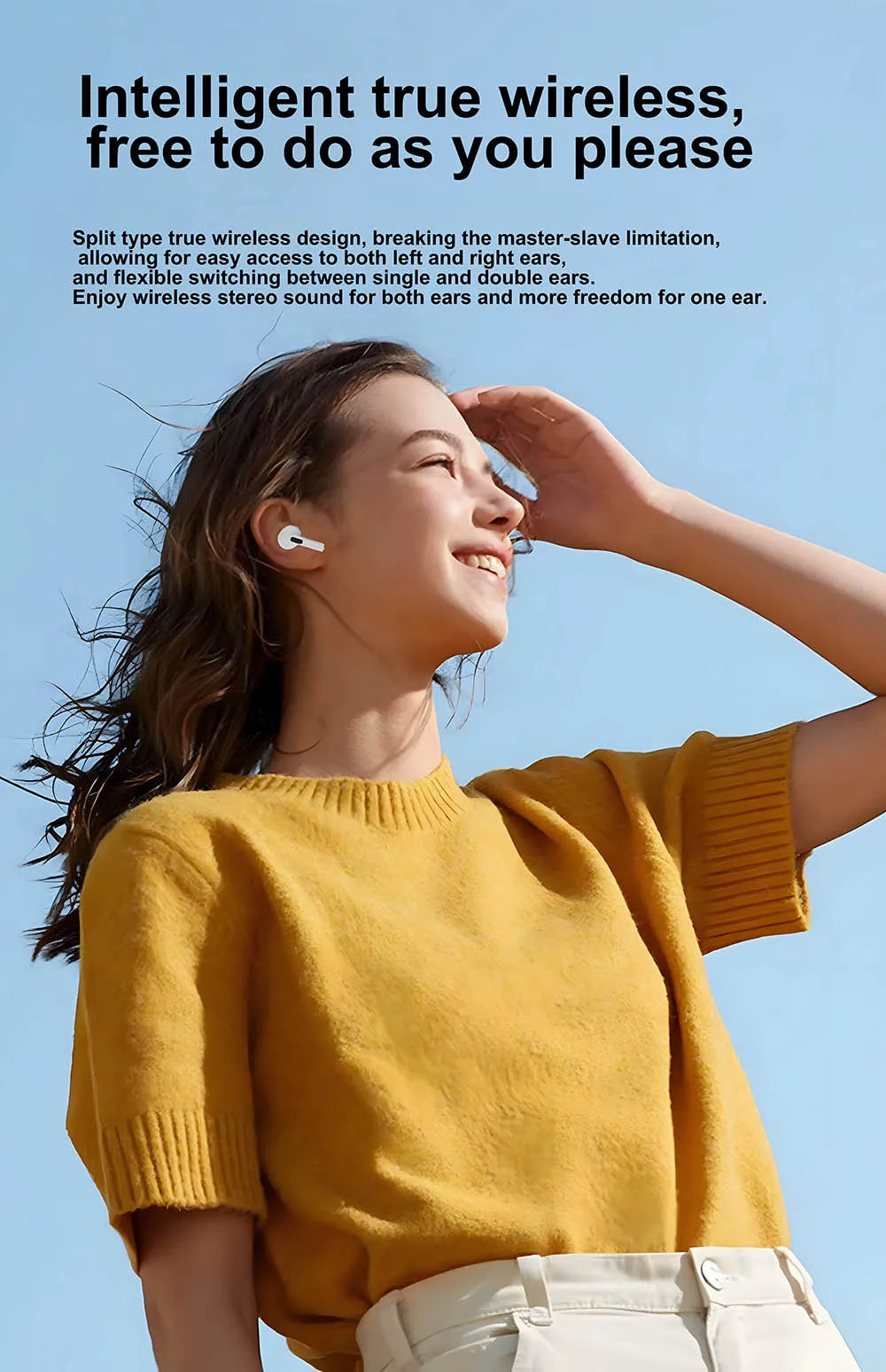 Split type true wireless design, breaking the master-slave limitation, allowing for easy access to both left and right ears, and flexible switching between single and double ears. Enjoy wireless stereo sound for both ears and more freedom for one ear.