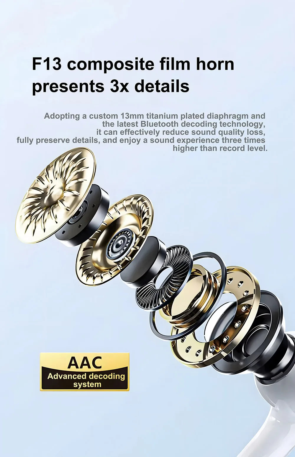 Adopting a custom 13mm titanium plated diaphragm and the latest Bluetooth decoding technology, it can effectively reduce sound quality loss,fully preserve details, and enjoy a sound experience three times higher than record level.