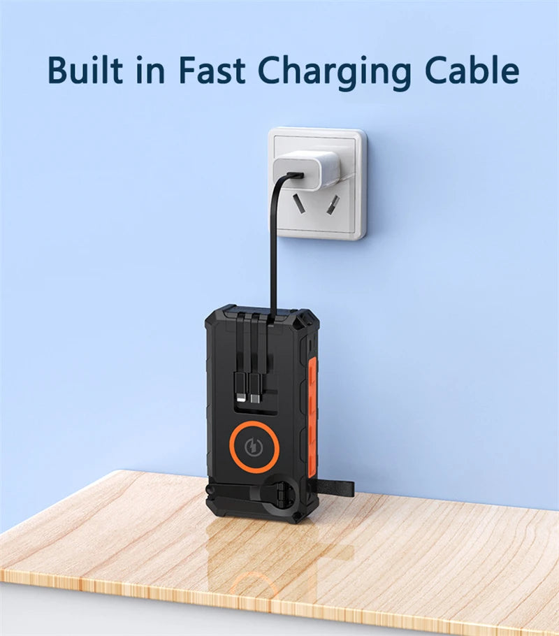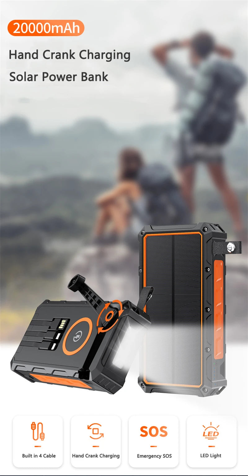 Banco de energia solar sem fio de 20000mAh com cabo, luz LED para acampar, carregador de manivela, banco de energia para iPhone 15 Samsung S23 Huawei Xiaomi Poverbank