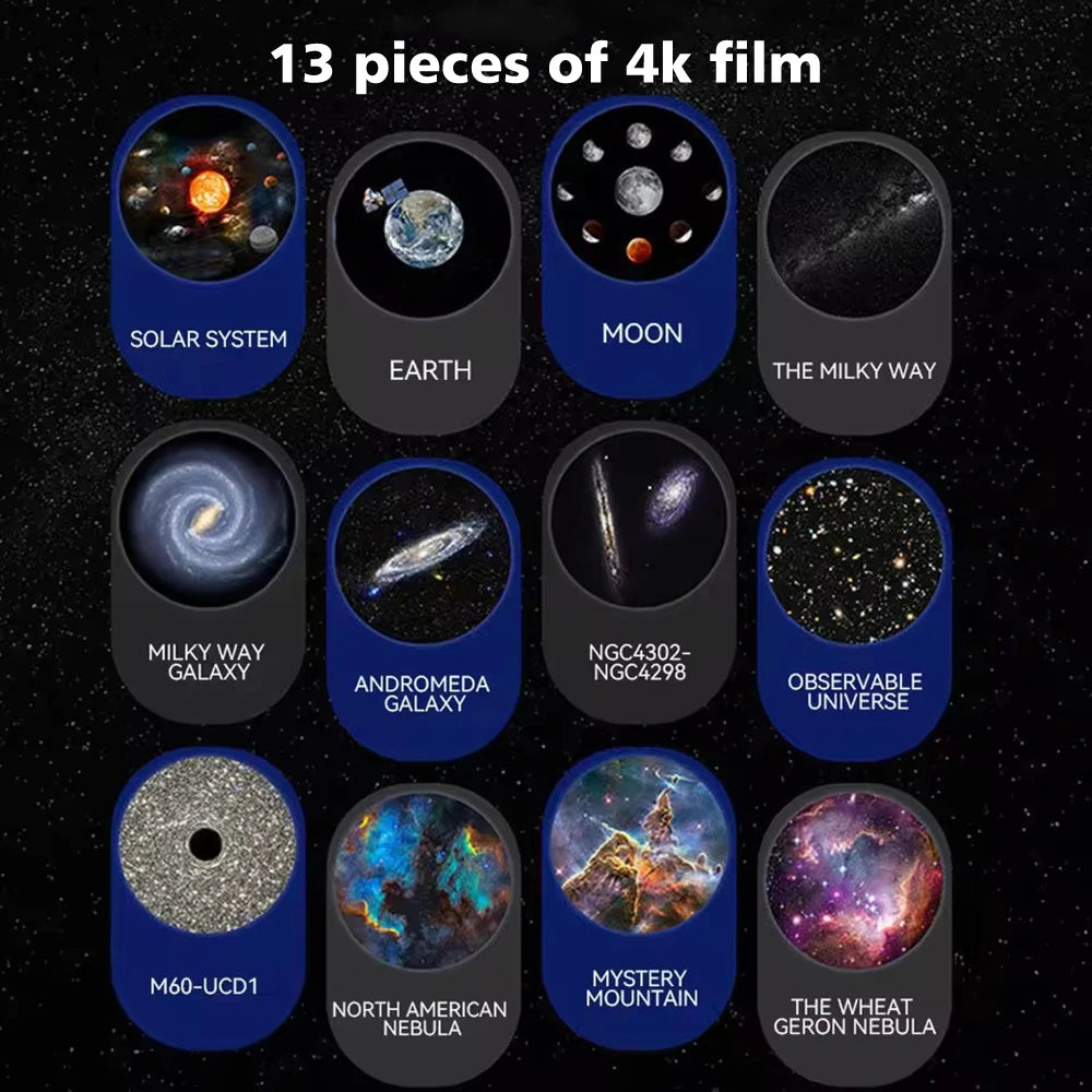 3. Rich journey of exploring the universe: built-in 13 pieces of carefully designed films, each of which carries the mysterious images of different galaxies and nebulae, from magnificent nebulae to romantic galaxies, quickly switch, and start a fantasy journey of exploring the mysteries of the universe at home.