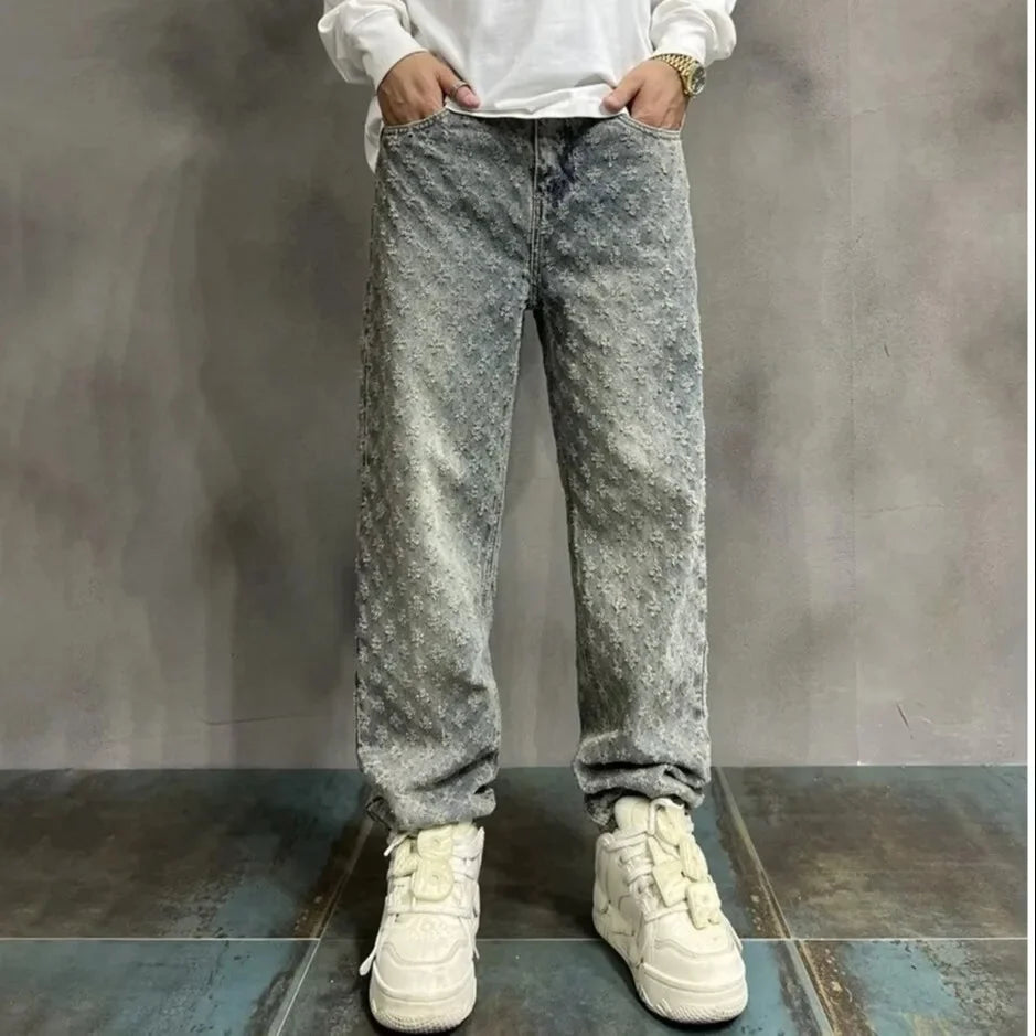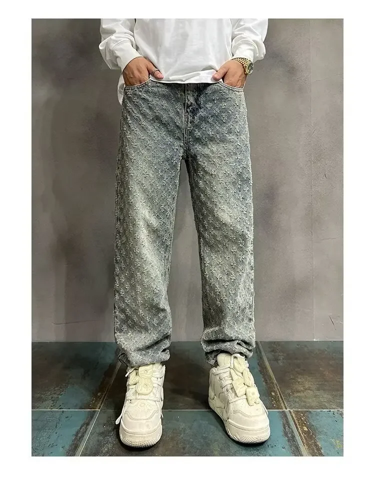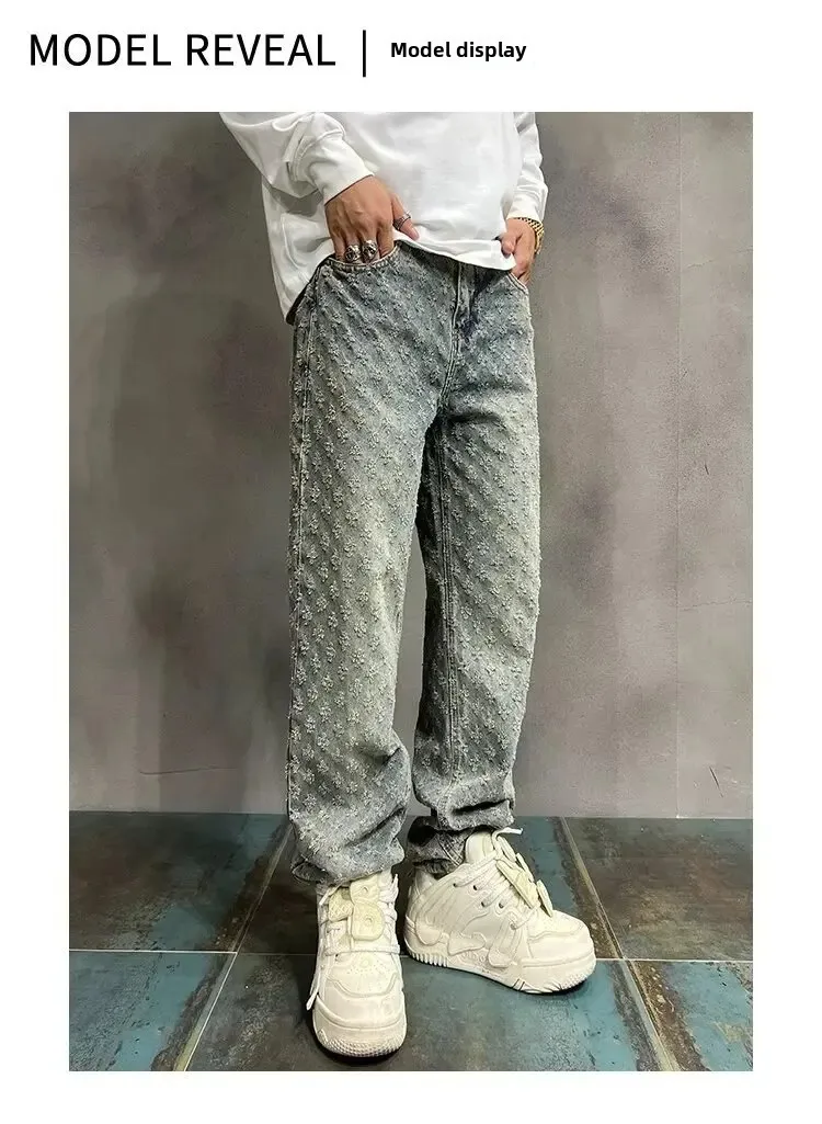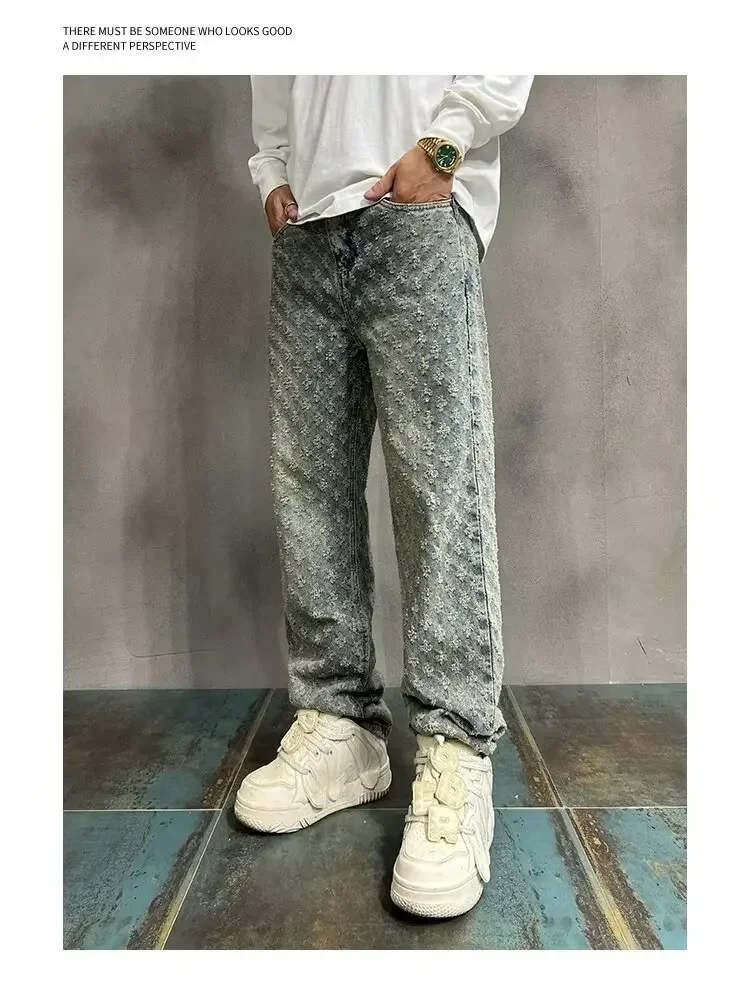 American Style Vintage Men's Jeans Loose Fit Full Printed Design Sensible Niche Straight Leg Pants New Spring Autumn Trendy Bran